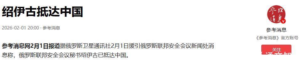 信息开端:2026-02-01 20:00·参考音信 绍伊古抵达中国