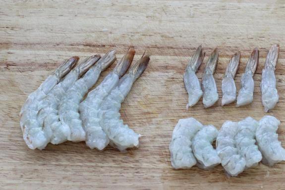 第一步,贬责大虾。买来的大虾先用净水冲干净,去掉壳和头,虾尾得留着,增多颜值。虾线抽出来,再把大虾一分为二,一半连着虾尾,一半光是虾肉。贬责完再洗一遍,控干水放一边。为什么要这样吃力?因为虾尾插在馅里,蒸出来颜面又可口,细节决定成败。