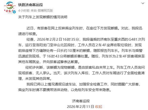 报谈中,网友杨先生称,2月2日太太乘坐G481次列车,从河南郑州前去四川成齐,下昼4时许,座椅下方钻出一只蜥蜴,被计帐垃圾的列车员发现,乘客那时“被吓坏了”。2月11日,济南客运段发布通报证据此事,称经初步判断,该蜥蜴为宠物蜥蜴,是由搭客暗自夹带上车。列车长与乘警将蜥蜴妥善措置,将搭客调度至其他车厢就座并谈歉。本日,该次列车入库后,使命主谈主员对车厢进行了全面查验计帐,未发现其他绝顶。