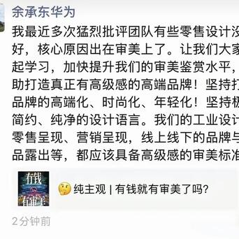 这不,余承东前两天刚发了一条一又友圈“自揭家丑”,默示我方最近屡次历害品评团队有些零卖野心没作念好,中枢原因出在审好意思上了,并让大家一皆学习,加速进步审好意思赏识水平,打造真确有高等感的高端品牌。